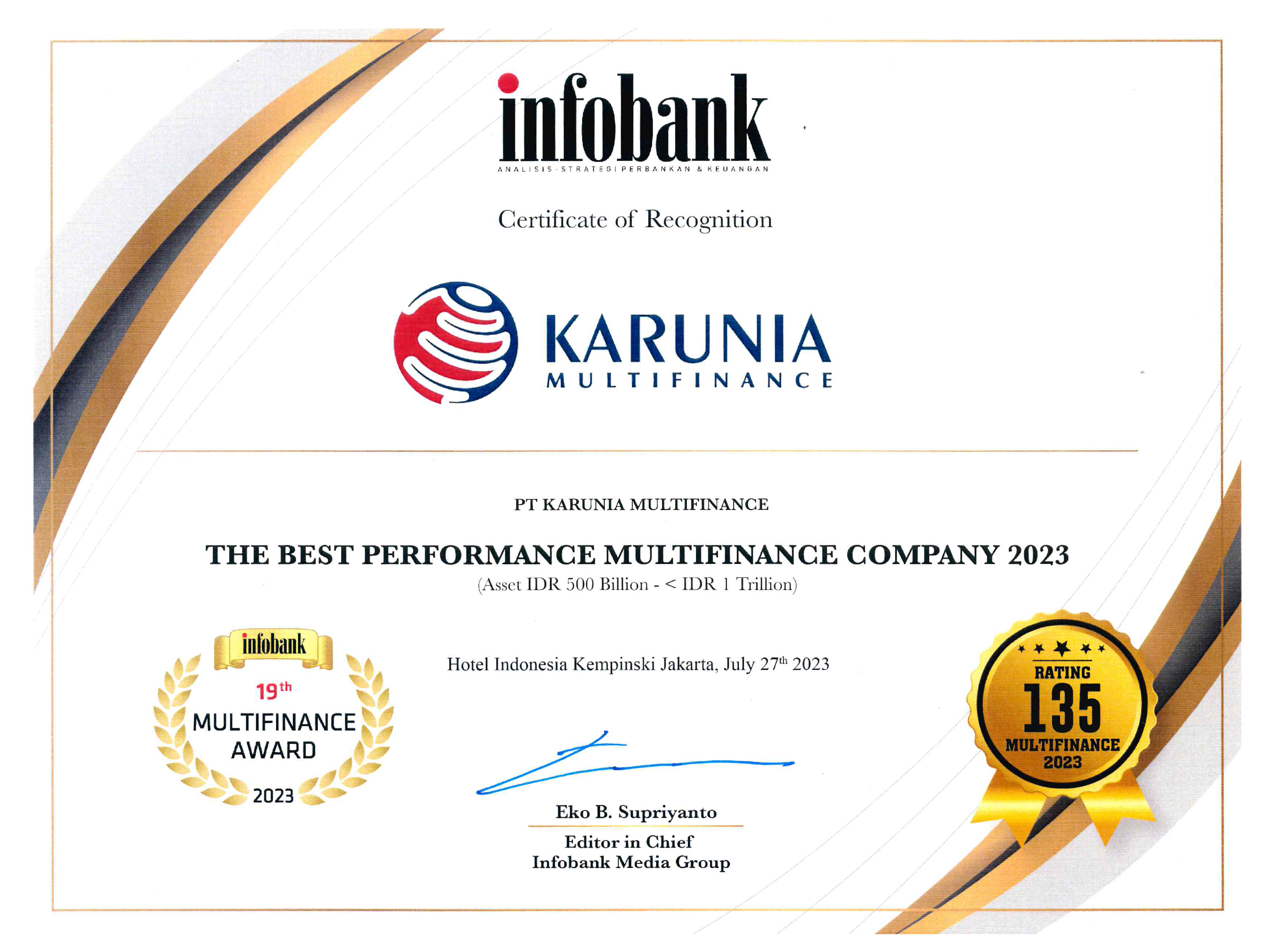 Selama 10 tahun berturut-turut, PT. Karunia Multifinance berhasil meraih penghargaan Multifinance Award dari Infobank